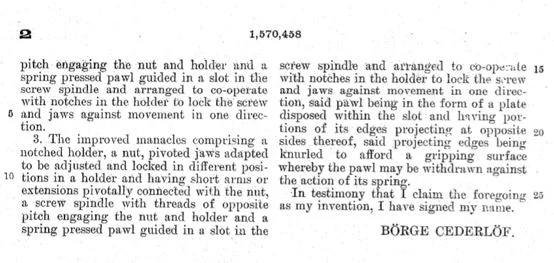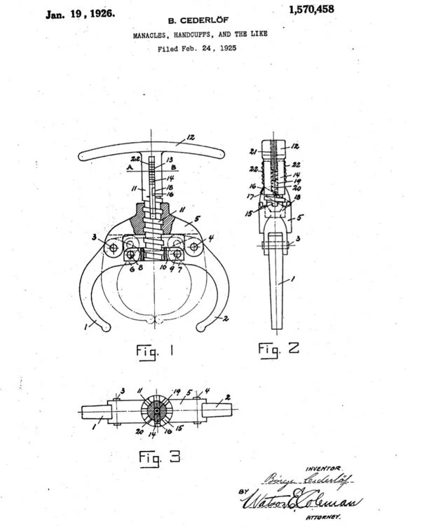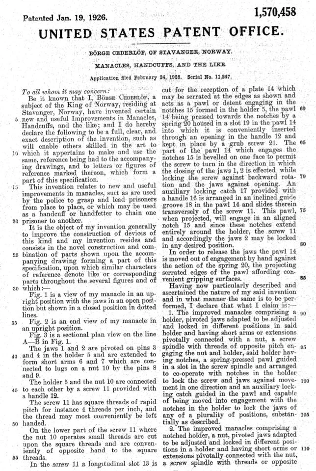 Be it known that I, Borge Cederlof, a subject of the King of Norway, have invented certain new and useful Improvements in Manacles, Handcuffs and the like